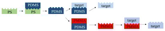 In recent years, polymeric honeycomb-like films via the BF process have received lots of scientific attention, especially in pursuit of practical applications [4,5,9,10,11,12,13,14,16,63]. These applications are classified in several fields, such as templating [64,65], surface-enhanced Raman scattering (SERS) [49,66,67,68,69,70], biomedical researches [43,71], electronic devices [72,73,74,75,76,77], etc. The ordered array films could serve as the templates to transfer certain patterns for polymers which are not easy to prepare directly by the BF method. For instance, a polydimethylsiloxane (PDMS) elastomer precursor was poured onto a PS honeycomb-like porous structures surface, and cured afterward (Figure 12). The PDMS microarrays were obtained and further transferred to other materials. This transferring process exhibits great potential for a wide variety of materials for replicating honeycomb-like films [78].