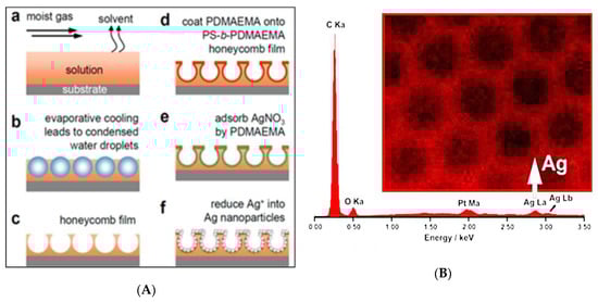 Schematic of the formation of honeycomb-like films with polymer-coated AgNPs [69]: (A) Formation of SERS substrates; (B) EDX mapping image of the Ag element on honeycomb-like film. © Reproduced with permission from the American Chemical Society (ACS).