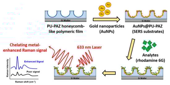 - Chiang, C.-Y.; Liu, T.-Y.; Su, Y.-A.; Wu, C.-H.; Cheng, Y.-W.; Cheng, H.-W.; Jeng, R.-J. Au Nanoparticles Immobilized on Honeycomb-Like Polymeric Films for Surface-Enhanced Raman Scattering (SERS) Detection. Polymers 2017, 9, 93. [Google Scholar] [CrossRef]