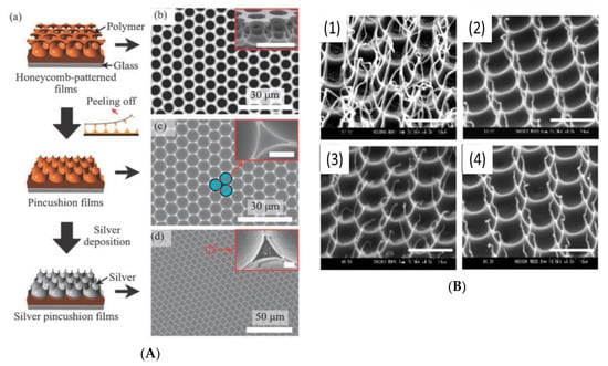 The SEM image peeling-off honeycomb-like patterned films [66]: (A) Silver pincushion films; (B) polymer pincushions of (1) PCL; (2) PLA; (3) PLGA and (4) PHB (bar: 10 mm) [71]. © Reproduced from [66] with permission from the Royal Society of Chemistry (RSC); © Reproduced from [66] with permission from the Wiley.