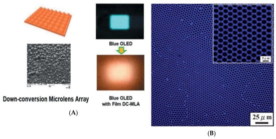 Honeycomb-like films for OLED: (A) Microlens array film for blue OLEDs and down-conversion white OLED [74]; (B) laser confocal fluorescence microscopy images of PF-b-PSA [77]. © Reproduced from [74] under open access license; © Reproduced from [77] with permission from the Royal Society of Chemistry (RSC).