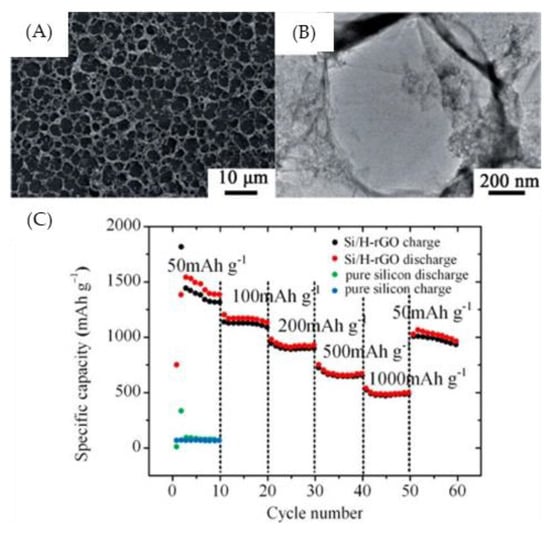 Images and performance of Si/H-rGO composite films. (A) SEM image of the Si/H-rGO composite; (B) TEM image of the Si/H-rGO composite; (C) rate capability of the Si/H-rGO composite film and pure silicon at various current densities ranging from 50 to 1000 mA g−1 [72]. © Reproduced with permission from the Royal Society of Chemistry (RSC).