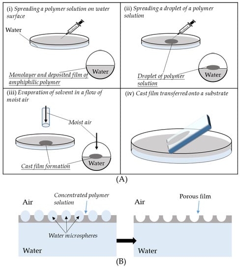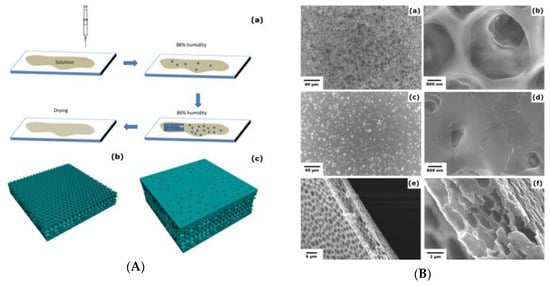 Honeycomb-like film was fabricated with water as the template [88]: (A) Fabrication process of a microporous film on a water surface; (B) formation of the porous morphology of a polymer film. © Reproduced with permission from the American Chemical Society (ACS).