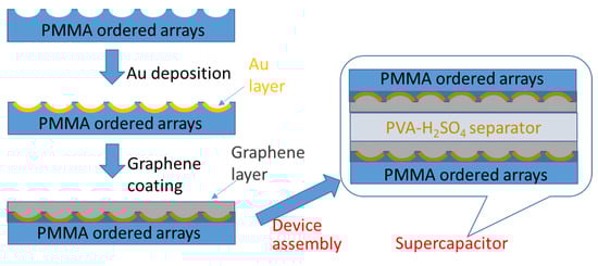 Abbaspour et al. [76] developed honeycomb-like surfaces on transparent poly(methyl methacrylate) (PMMA) films using a facile direct breath figure (DBF) method. This was utilized as an electrode for solid-state supercapacitors (Figure 19). The pore size of the ordered arrays on the PMMA surface exhibited diameters in a range of 0.5 to 10 μm. Subsequently, a graphene layer was deposited on the surface by spray-coating. The solid-state supercapacitor with a honeycomb-like surface showed superior specific capacitance when compared with the flat one.