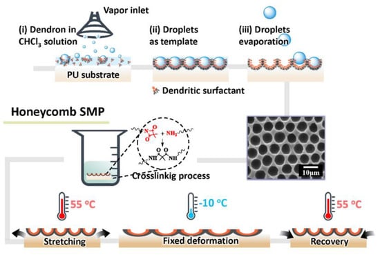 More recently, Wu et al. [29] also adopted a modified DBF process to prepare a honeycomb-like structure on a PU substrate with shape memory effect (Figure 20). This approach is set forth to deal with the thickness issue for the traditional BF method. A chemical cross-linkable shape-memory PU with active side chains was utilized as the substrate material. A small amount of an amphiphilic dendron was utilized as surfactant to form a honeycomb-like structure on the PU substrate via a BF process [28]. As a result, a honeycomb-like structure with shape memory behavior and switchable wettability was realized.