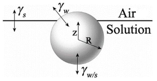 CS2 and chloroform were the most commonly-used solvents in preparing honeycomb-like films due to their water immiscibility, lower boiling point, and good solubility for polymers. The first polymeric honeycomb-like films were developed by exposing a drop of polystyrene-b-polyparaphenylene solution in CS2 to a flow of moist air by Francois et al. in 1994 [3]. The pore size and shape depend on the self-assembly process between water droplets–solvent interface [89,90]. During the nucleation condensation process, the pore regularity and size were dominated by the interfacial properties between water droplets and polymer solutions. During this stage, the solvent played a critical role in maintaining the interfacial balance between solvent–water and solvent–substrate for a polymer solution. In particular, the interfacial properties between the water droplets and the solvent would mainly influence the morphology of honeycomb-like films. The interfacial energy balance (z0) can be defined as: z0 = z/R = (γw − γw/s)/γs, where z is the distance between the droplet center and the air–solution interface; R is the droplet radius; γw/s is the interfacial tension between water and solution; γw and γs are the surface tension of the water and the solution, respectively (Figure 22). Consequently, the shape of ordered arrays can be predicted by the calculation of interfacial energy balance.