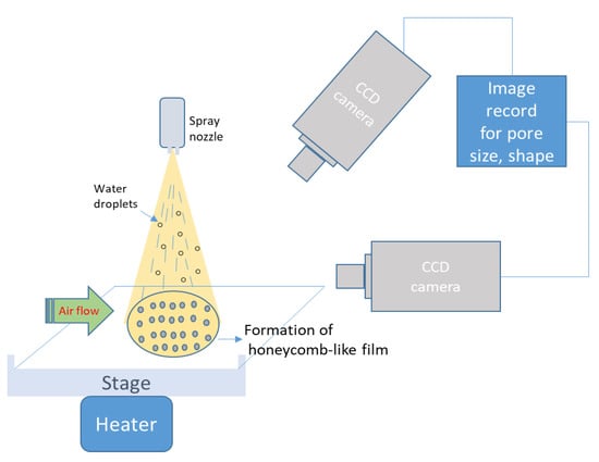 In order to understand the nucleation mechanism of water droplets on the solution surface and evaporation during the BF process, a high-speed camera system was set up to observe the real-time images [91,92,93,94,95]. Therefore, the formation of ordered array pores could be closely monitored. The layout of a high speed camera with temperature control equipment and the actual system setup are shown in Figure 23.