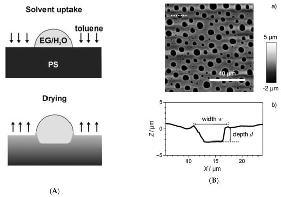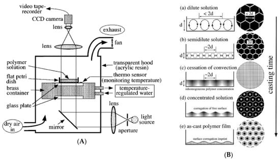 Toluene for honeycomb-like films: (A) Experimental set up for in situ observation of the surface corrugation pattern process; (B) schematic illustrations of casting solutions and results [106]. © Reproduced with permission from Elsevier.