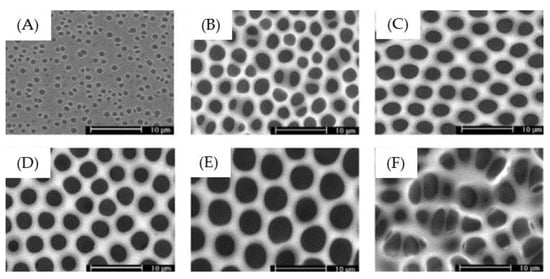 The SEM images of SAN copolymer in THF solution (0.08 g/ml) under various relative humidity at 25 °C after BF processing: (A) 30%; (B) 40%; (C) 50%; (D) 60%; (E) 70%; (F) 80% [118]. © Reproduced with permission from Elsevier.