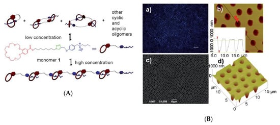Supramolecular polymer for honeycomb-like films [116]: (A) Self-organization of supramolecular; (B) images of honeycomb-patterned films. © Reproduced with permission from the Royal Society of Chemistry (RSC).