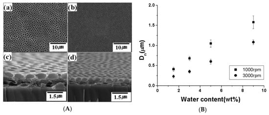 In the past two decades, a large number of polymers have been developed for fabricating honeycomb-like films with micro- and nano-structures by a dynamic templating technique, namely the BF process [4,5,9,10,11,12,13,14,15,16]. Some features such as (1) high quality of film forming; (2) water immiscible, and (3) efficient stabilization of water droplets are considered to afford a polymer solution for preparing honeycomb-like films by the BF method. Among these polymers, amphiphilic polymers [16,17,18,19] and functionalized block copolymers [20,21,22], capable of balancing the hydrophobicity and hydrophilicity of the solution–water interface, are favorable for forming ordered arrays during the BF process. In one particular example, an ionic group/counter-ion effect on porous polymer film morphology was investigated based on a series of PH3T-b-PMMA diblock copolymers [20]. In addition, a series of amphiphilic hyperbranched polymers were developed by Dong et al. to obtain 5–6 μm diameter pores, and the depth of pores were increased with increasing solution concentration [23]. Apart from that, star and branch polymers with high segment density were also one of the popular materials for fabricating honeycomb-like films [24,25,26,27,28,29]. On the other hand, certain small molecules with special functional groups, such as melamine units, would induce a supramolecular assembly through the interactions of hydrogen bonding. This makes it possible to form ordered honeycomb-like films via the BF method [30]. It is important to note that surfactants were capable of acting as the driving force to induce the self-assemble behavior in the formation of ordered arrays [31,32,33]. Furthermore, honeycomb-like films could be fabricated based on certain polymers used as matrices for nanoparticles (NPs), carbon nanotubes (CNTs), quantum-dot [34], or graphenes [35]. In one example, ordered arrays of an elastomer–CNT nanocomposite were achieved based on the mixture of styrene–butadiene–styrene (SBS) and amine-terminated polystyrene (PS-NH2) solution [36]. Apart from that, the self-assembly of nanoparticles at the oil–water interface (Pickering emulsions) in the BF process have been widely utilized for honeycomb-like micropatterning [35,37,38,39,40,41,42]. In fact, rings of nanoparticle-decorated honeycomb-like polymeric films could be observed with the combination of Pickering emulsions and capillary flow via the BF method [40]. Researchers also fabricated honeycomb-like films built on a photo-curable and biodegradable polycaprolactone triacrylate (PCLTA) [43]. UV light was irradiated onto the sample at the stage of water droplet condensation. Subsequently, the ordered arrays were formed when tetrahydrofuran (THF) was evaporated completely.