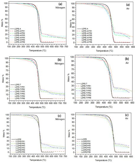 TGA curves under nitrogen and air of FR-containing compounds (a) LDPE-A, (b) LDPE-T, (c) LLDPE.