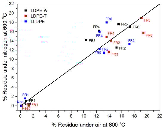 The residue in the TGA can also be correlated with the formation of a protective char layer during the polymer combustion [1,7,8,11,20,22,23] (Figure 3). FR1, which contained a nitrogen-based additive, failed to increase the char yield, so it is anticipated that the relevant formulation will not be efficient due to a lack of the acid source. On the other hand, the addition of the other FRs dramatically increased the residue under air and nitrogen atmospheres, reaching almost 19% under nitrogen at 800 °C, with the highest value observed for FR4 (16.2 ± 0.4%) for LDPE-A, FR5 (19%) for LDPE-T, and FR6 (18%) for LLDPE. It is important to emphasize that the low residue of the pure pentaerythritol derivatives (Charmor DP40 and PP100) was not observed in the FR5 and FR6 formulations, since along with the acid source, they can result in an effective intumescent system. However, it should be pointed out that in the literature, there is no direct correlation between the char residue and the UL94 V ranking; when the compound presents higher residue, it presents potentially better flammability properties, but it is not necessary that the highest amount of char gives V0 in UL94 ranking. This also has to do with the proper ratio of charring agent to acid source, so as to produce the optimum char layer morphology, e.g., tiny bubbles embedded on the surface of each large bubble, and a compact and continuous intumescent char [1].