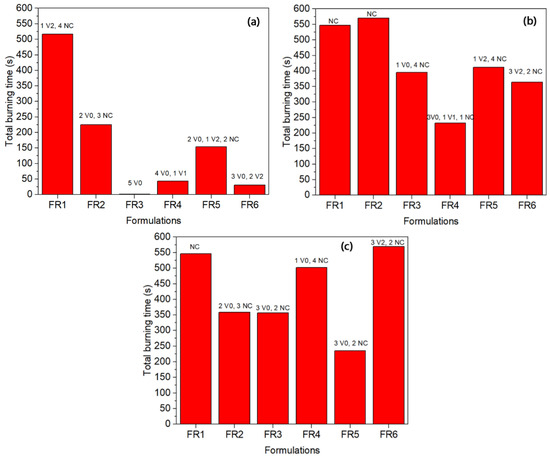 UL 94 V results (total burning time, ranking) for FR-containing polyethylene grades. (a) LDPE-A, (b) LDPE-T, (c) LLDPE.