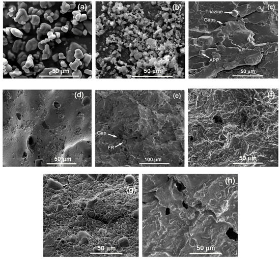 Comparison between FR3-containing fractured surfaces of UL94 bars: (a) Neat APP, (b) neat Triazine, (c) LDPE-A/FR3 prior to UL 94, (d) LDPE-A/FR3 char after UL 94, (e) LDPE-T/FR3 prior to UL 94, (f) LDPE-T/FR3 char after UL 94, (g) LLDPE/FR3 prior to UL 94, and (h) LLDPE/FR3 char after UL 94.
