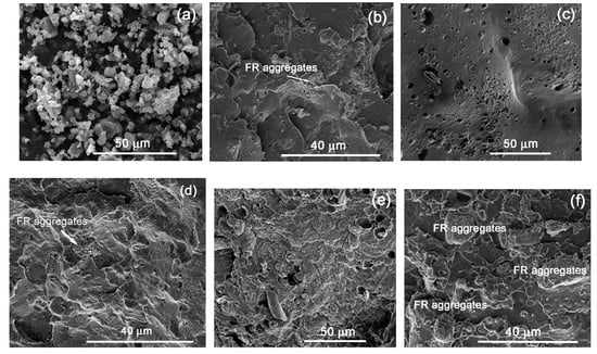 Starting with the grade LDPE-A/FR3, which gave the safest V0 ranking result, it can be seen that the additives (APP, Triazine, Figure 5a,b) were well dispersed in the polymer matrix with a small number of aggregates (Figure 5c). The smooth surface of the commercial APP [22] and the shape of Triazine HF can be distinguished in consistence with similar SEM images for APP systems in polyolefins [23]. However, the additives’ incorporation induced some gaps/voids and cavitations, that are a sign of incompatibility and can have a negative impact on the mechanical properties [22]. The gaps/voids can especially be attributed to the premature decomposition of the APP due to internal shear and the release of NH3. The char (Figure 5d) for LDPE-A/FR3 looks dense and coherent with an intense foamed structure. Despite the formation of some small holes, a nicely formed intumescent layer is observed which successfully prevented oxygen and heat exchange to penetrate deeper into the material, thus showing the best herein flame retardance performance [20].