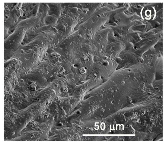 On the other hand, in the FR4-containing grades (Figure 6), the voids are significantly less, but in all cases agglomeration of the additive particles is evident, which seems to be the main reason for the inconsistency in the FR results, even in the case of LDPE-A. However, the dispersion problems are more obvious in the case of LLDPE, probably due to the higher melt viscosity. The char quality for all the FR4 grades was also investigated by SEM. Accordingly, LDPE-A/FR4 (Figure 6c) showed a surface similar to that of LDPE-A/FR3, but the swelling of the surface was weaker with numerous tiny holes. This resulted in a lower UL94 classification, nevertheless still four V0 classifications were achieved. On the contrary, in the cases of LDPE-T/FR4 (Figure 6e) and LLDPE/FR4 (Figure 6g), the char morphology was totally different: almost no swelling of the surface and a discontinuous char, resembling the initial morphology of the surfaces prior to the burn test.