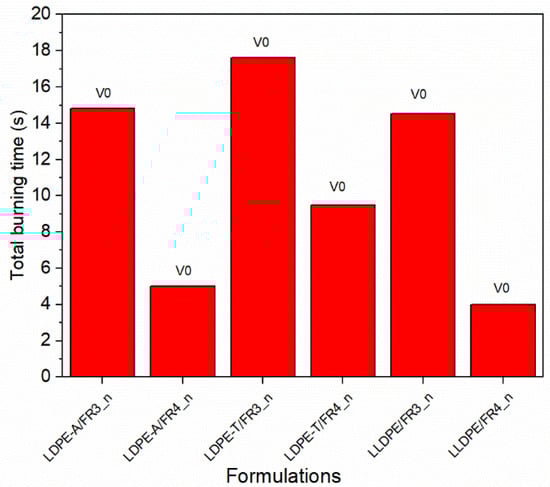 To address the dispersion problems and to obtain a more reliable flammability performance, especially for the LDPE-T and LLDPE grades, we tested six (6) additional FR formulations (Table S5 in the Supplementary Information) based on the most promising ones (FR3 and FR4) using compression molding to manufacture the UL94 bars instead of injection molding, so as to dissipate the melt viscosity issues. The new compounds presented stable V0 classification with no dripping and total burning times ranging from 4.0 to 17.6 s (Figure 7), revealing a reliable FR performance due to the higher UL94 bars’ homogeneity.
