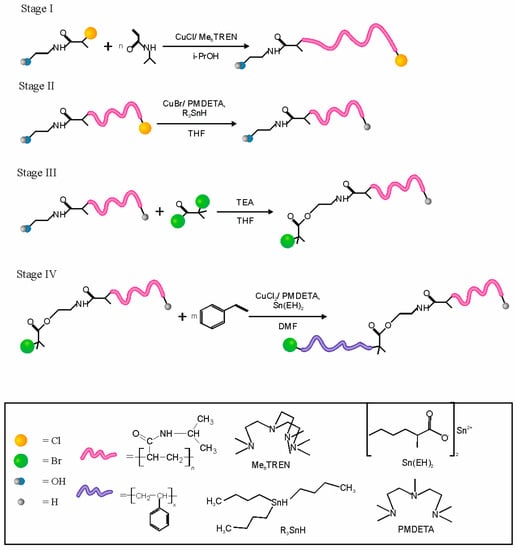 The polymers prepared using NCPAE as an initiator and CuCl/Me6TREN as a catalyst are terminated by chlorine (see Figure 1, Stage I). Thus, theoretically it should be possible to use them as macroinitiators in ATRP of styrene. However, our studies proved that the chain extension with styrene of PNIPAMs terminated with chlorine (PNIPAM-Cl) occurs with a very poor initiation efficiency and only 2–8 mers could be attached (see Table S1 in Supplementary Material). Therefore, we decided to develop a procedure which replaces a terminal chlorine atom with a terminal bromine atom; although this replacement doesn’t necessarily occur can at the same position in the polymer molecule. To avoid a partial extension of the polymer chains via transfer of chlorine atoms, first the removal of chlorine atoms from the polymer chains was performed through a dehalogenation process. The dehalogenation was carried out using tributyltin hydride according to the procedure described by Coessens and Matyjaszewski []. After the dehalogenation process, only minimal changes in molecular weight and molecular weight distribution were observed (see Table S2 in the Supplementary Material).