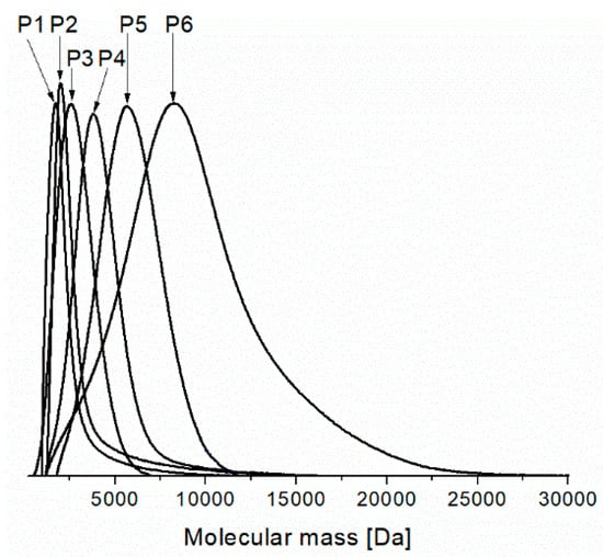 The molecular weight distribution curves from Size-Exclusion Chromatography (SEC) analyses for the prepared PNIPAMs (descriptions of the samples P1–P6 and polymerization conditions are given in Table 1).