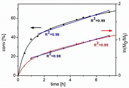 Conversion of monomer vs. time and first-order kinetic plot (right axis) for the Atom Transfer Radical Polymerization (ATRP) of NIPAM. Polymerization conditions: [NIPAM]:[NCPAE]:[CuCl]:[Me6TREN] = 50:1:1:1, room temperature, isopropanol as a solvent (1:2 NIPAM:solvent, w/w). The black and red arrows indicate a proper axis for the relationship shown in the same color.