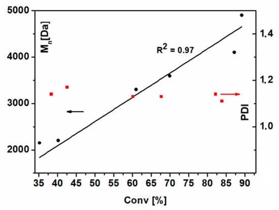 The linear relationship between Mn and conversion is fairly good (R2 = 0.97) and the PDI values are below 1.2 in the whole analyzed range of monomer conversions (from 30% to 90%). This indicates that the contribution of termination reactions is significantly diminished, even for high conversions.
