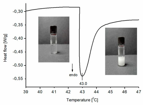 The heating DSC thermogram for an aqueous solution of P1 (1.5% w/w) and photos of the solution below and above the phase transition corresponding to the endothermic effect visible on the curve. The heating rate of 1 K/min.