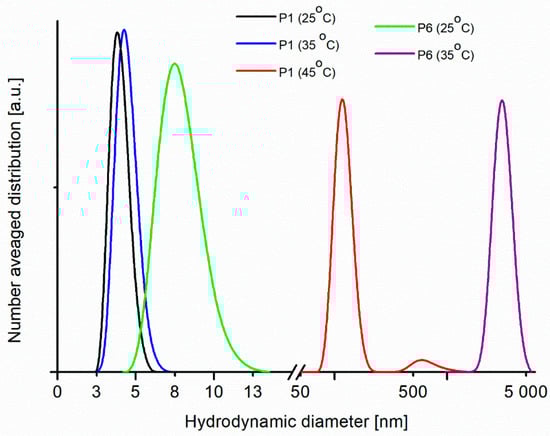 The hydrodynamic diameters of particles were determined in the solutions at 25, 35 and 45 °C. Figure 6 shows the number-averaged hydrodynamic diameter distributions in aqueous solutions of P1 and P6 with the same concentration (1.5% w/w).