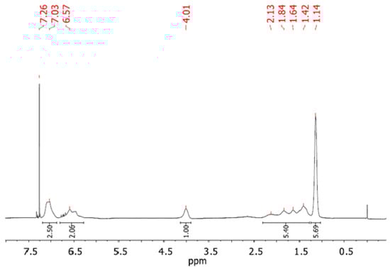 Figure 7 shows a 1H NMR spectrum recorded for one of the prepared copolymers, denoted in Table 3 as PNPS2. The spectrum reveals the presence of both blocks in the prepared copolymer. From the proton integration of the signals at 6.25 ppm to 7.25 ppm (characteristic for aromatic protons in the PS block and NH proton in the PNIPAM block) and 4.01 ppm for isopropyl proton (CH(CH3)2) of the PNIPAM block, the ratio of the repeated units in both blocks may be estimated as 1:0.7 PNIPAM:PS. It is in a good agreement with the results from SEC (see Table 3). The 1H NMR of other synthesized copolymers can be found in in the Supplementary Material (Figure S2).