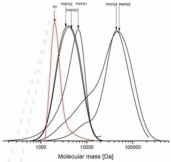 As can be seen in Figure 8, chain extension during the polymerization process is evident. For all the studied copolymers, we observe a monomodal distribution of molecular mass, whereas for PNPS4 and PNPS5 the distribution curves are broad with an accompanying shoulder on the lower masse side. The shoulders visible in the distribution curves are due to the contributions of terminated polymer chain fractions in the polymer sample. On the other hand, the mass distribution curves for PNPS2, PNPS3 are symmetric without the shoulders and the distribution of the molecular mass is relatively narrow for both of them. For the sample denoted as PNPS1, the distribution is narrow, albeit with a small tailing of the peak occurring. It is a likely result of the presence a small fraction composed of fast growing and terminated polymer chains. In general, the SEC analyses proved that the narrowest MWD (among those systems studied) could be achieved using CuCl2/PMDETA as a catalytic system via ARGET ATRP procedure.
