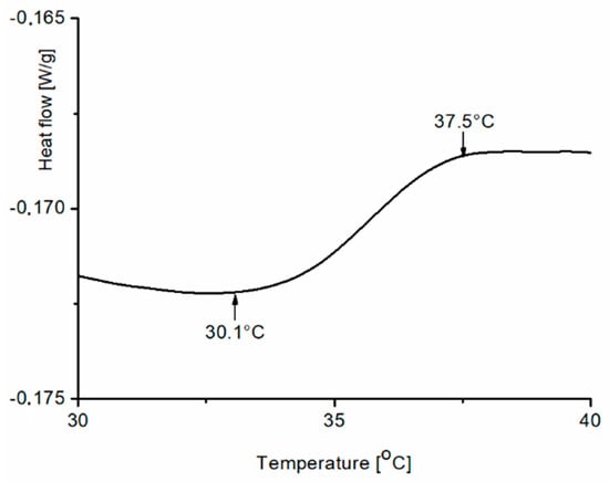 The synthesized block copolymers were analyzed to check their thermosensitivities using DSC and DLS. The aqueous solutions of the prepared copolymers were studied by DSC within the range of temperatures 30–45 °C. Figure 9 shows an example of a heating DSC thermogram for one sample among the synthesized copolymers (PNPS2) with a heat capacity change observed between 30.1 °C and 37.5 °C.