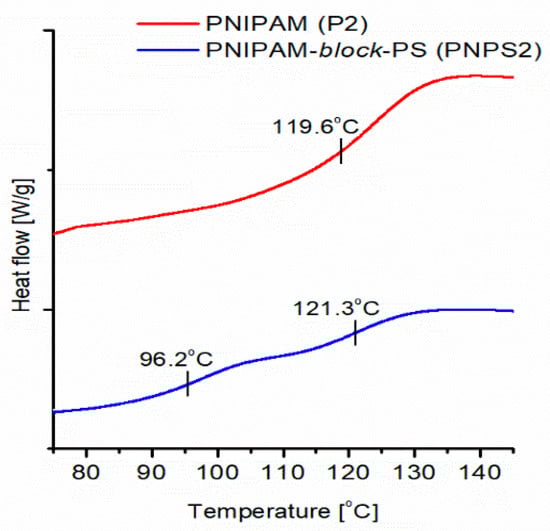 In the thermogram of the synthesized copolymer, two separate Tgs are observed at 96.2 °C and 121.3 °C corresponding to the PS and PNIPAM blocks, respectively.