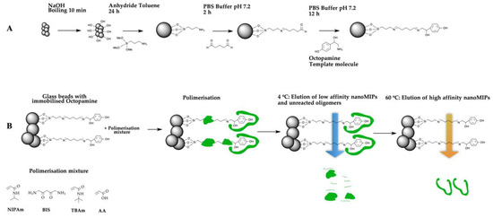 (A) Procedure for the immobilisation of octopamine on the surface of the solid support (glass beads). (B) Scheme of the synthesis of molecularly imprinted polymer nanoparticles (nanoMIPs) made for octopamine. Low-affinity particles and oligomers of the synthesis were washed at 4 °C. High-affinity nanoMIPs were collected at 60 °C.