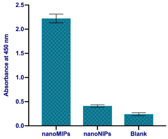 Each microplate well was coated with nanoMIPs by dispensing 40 μL of different concentrations varying from 0.00056 to 0.56 mg·mL−1 followed by overnight evaporation. Further, each well was conditioned by washing with 0.01 mol·L−1 PBS (2 × 250 μL) followed by 1 h blocking with 300 μL of 0.01 mol·L−1 PBS containing 0.1% of BSA and 1% of Tween 20. After further washings with 0.01 mol·L−1 PBS (3 × 250 μL), 100 uL of HRP-O conjugate (1:1200) was added to each well. The microplates were incubated in the dark at ambient temperature for 1 h. After washings with 0.01 mol·L−1 PBS (3 × 300 μL), containing 0.1% of BSA and 1% of Tween 20, TMB reagent (100 μL) was added and incubated for 10 min. The enzymatic reaction was stopped by the addition of H2SO4 (0.5 mol·L−1, 100 μL) and the absorbance of each microplate well was measured at 450 nm using the UV/Vis microplate reader (Figure S3).