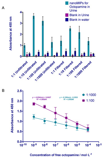 After the experiments were performed in water, MINA was evaluated in the real human urine samples. Human urine is the most common matrix for analysis of forbidden substances in sport used for doping. Firstly, the assay had to be optimised in order to minimise interferences of the urine matrix and maximise the sensitivity of the method. Therefore, the absorbance of four different dilutions of the filtered and unfiltered samples was measured and compared in Figure 5A. Control experiments were performed in water and urine samples using uncoated microplates (blanks). In all the cases, the nanoMIPs assay prepared for octopamine revealed high selectivity compared with both types of blank experiments. Slightly lower absorbance was observed for the samples without dilutions and filtration, but already 1:10 dilutions significantly improved the signal. Based on the intensity of absorbance and lower interferences from the matrix, the best solution was chosen at 1:100 and 1:1000 dilution of the urine. Finally, the calibration curve for the detection of octopamine in urine samples was performed using two selected dilutions (see Figure 5B. The linearity of the assay was defined as r2 = 0.9827 and r2 = 0.9930 for the dilutions 1:100 and 1:1000, respectively. The assay presented a linear response in a concentration range of 1 nmol·L−1–0.0001 mol·L−1. The results indicated that free octopamine could be detected within five orders of magnitude of the concentration range plotted on a logarithmic scale. The LOD was 0.059 ± 0.00281 µg·mL−1 and the LOQ was 0.1947 ± 0.00915 µg·mL−1, it was calculated from 24 times the value of the standard deviation of the control (in the absence of octopamine).