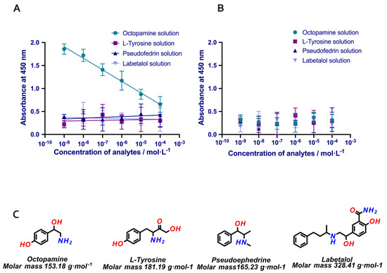 In order to evaluate the cross-reactivity and the selectivity of the MINA assay, the competitive assay was performed with three molecules two analogues of octopamine, l-tyrosine and pseudoephedrine, and labetalol, which is another prohibited compound in the sport. The cross-reactivity assay was performed in human urine samples