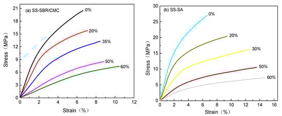 As seen in Figure 2a,b, SA and its composite revealed better resistance to tensile rupture than SBR/CMC matrices with the same SS content. When the loadings of carbon black increased, tensile strength and stiffness decreased remarkably for the cured BCC film. It can be clearly observed from Figure 2c,d that the composite samples doped with 60% SS had about 25% maximum stress (σb) and Young′s modulus (E) of their unfilled counterparts. These results are similar to the evidence that conductive acetylene black filled PVdF composites showed a lower strength and stiffness [21,23,24]. On the contrary, the evolution of σb and E contrasted with the ratio (σb/E) of BCC films rose as the loading of SS increased from 0% to 50%, as shown in Figure 2e. However, it gradually decreased with the further increase of carbon black. Moreover, with an increasing concentration of SS particles, BCC films exhibited higher elongation (εf) at a fracture. Therefore, adding the suitable loading of conductive carbon black (≤50% SS) can help the aqueous polymer improve its resistance to tensile rupture due to an increased σb/E and εf of the elastomers.