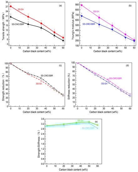 It should be noted that neat SA films revealed better tensile properties compared to CMC/SBR; the effect of the conductive agent addition on the reduction of σb and E is relatively noticeable for SA matrices. Nevertheless, the ratio of the tensile strength to modulus and the breaking elongation of SS-SA is larger than SS-CMC/SBR at the same carbon black content from 0% to 60%. This indicates that any SA-based composite may hold great promise for application in the field of secondary battery electrodes.