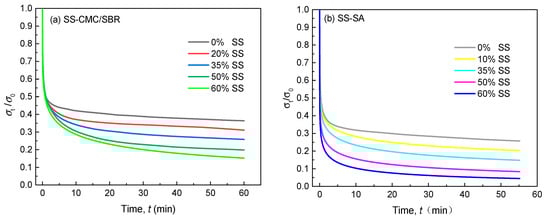 Normalized stress relaxation curves of cured (a) SS-SBR/CMC and (b) SS-SA films.