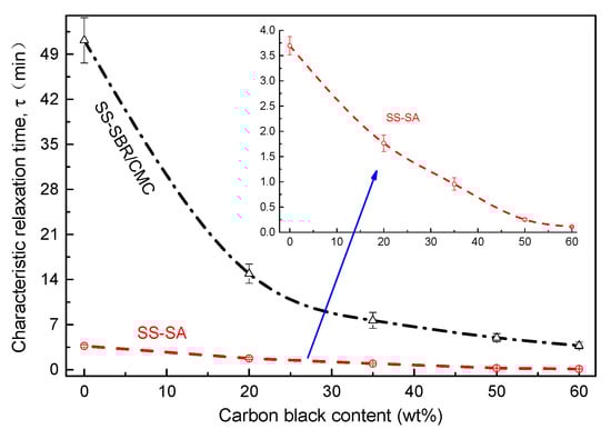 Evolution of the characteristic relaxation time of BCC films against carbon black content.