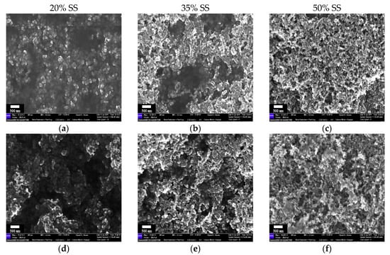 Effects of carbon black content on SEM of cured BCC films (SS-CMC/SBR: (a–c); SS-SA: (d–f)).