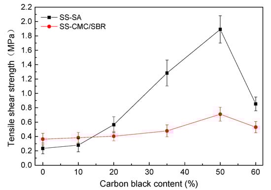 Effect of carbon black (SS) content on tensile shear strength of BCC with various aqueous polymers.