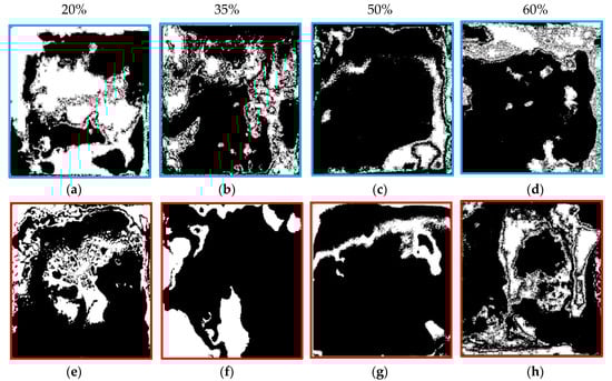 Optical photographs of failure interface between current collector (white color) and BCC (black color) containing various carbon black contents (CMC/SBR: (a–d); SA: (e–h)).