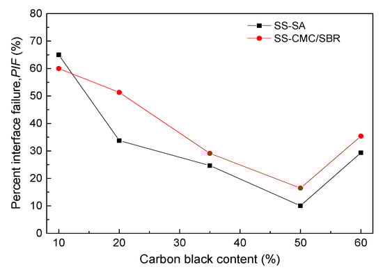 In order to go deep into understanding the effect of SS loading on the bonding performance of SA and CMC/SBR, an optical microscope was employed to check the surface morphology of the rupture interface between BCC binder and Cu foil. As shown in Figure 7, the surface of Cu foil after the tensile shear test can be divided into white and black regions, which represent the Cu current collector and BCC coating, respectively. It is clearly observed that the black zone in Cu surface gradually enlarged as carbon black concentration in BCC increased from 20% to 50%, which indicated that predominant fracture modes increasingly switched from “adhesion failure” to “cohesion failure”. In another word, bonding strength was primarily dependent of the mechanical properties of BCC coating. On the basis of the strength theory, an increase in the ratio of strength to modulus (σb/E) boosted the mechanical integrity. As higher SS content (0–50%) in the composite lead to enlargement of σb/E, as seen in Figure 2e, it can be understood that BCC doped with SS loading of 50% offered the best results for bonding the Cu current collector. However, excess carbon black particles also reduced the resistance of BCC-bonded Cu to the interface rupture due to the decrease in ratio of strength to stiffness of the BCC coating layer. Moreover, compared with the surface morphology of the failure interface between SS-CMC/SBR and Cu, much of current collector surface was covered with SS-SA coating at the same content of carbon black. In terms of the area ratio of white region to whole cross-section, percent interface failure (PIF) against SS loading was obtained as plotted in Figure 8.