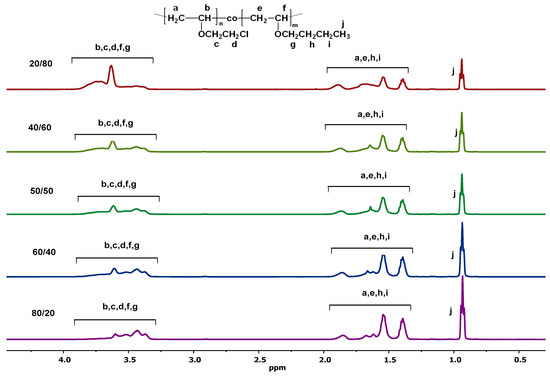 1H NMR spectroscopy was employed for the characterization of the samples. The calculation of the copolymer composition was based on the integration of the peaks of the methyl hydrogens of the BVE’s side groups at 0.9 ppm and the signals resonating at 3.2–3.7 ppm (methine and methylene protons of both monomer units). The NMR spectra are provided in Figure 1.
