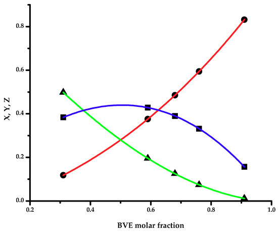 Dyad monomer sequence distributions X = MBVE-BVE (●), Y = MCEVE-CEVE (▲) and Z = MBVE-CEVE (■)of the statistical copolymers.