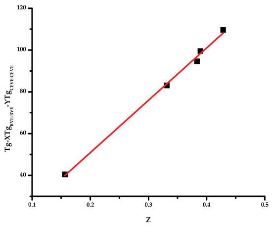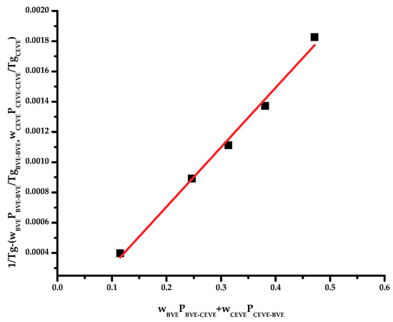 It is assumed that the BVE-BVE, CEVE-CEVE and CEVE-BVE or BVE-CEVE dyads have their own glass transition temperatures, TgBVE-BVE, TgCEVE-CEVE and TgBVE-CEVE, respectively. TgBVE-BVE and TgCEVE-CEVE can be considered the glass transition temperatures for the respective homopolymers, whereas TgBVE-CEVE is the glass transition temperature of the alternating copolymer P(BVE–alt–CEVE). Wi is the weight fraction of the i component and PBVE-BVE, PCEVE-CEVE, PBVE-CEVE and PCEVE-BVE are the probabilities of having various linkages. These probabilities can be calculated using the monomer reactivity ratios: