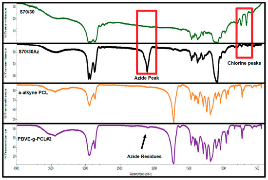 Monitoring the synthesis of sample PBVE–g–PCL#2 via the grafting “onto” methodology by IR spectroscopy.