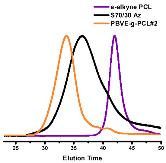 Monitoring the synthesis of sample PBVE–g–PCL#2 via the grafting “onto” methodology by SEC.