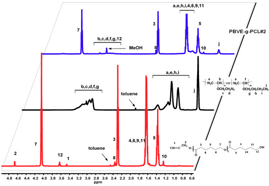 Monitoring the synthesis of sample PBVE–g–PCL#2 via the grafting “onto” methodology by 1H NMR spectroscopy in CDCl3.